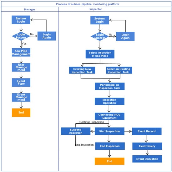 Deep learning models are at the heart of subsea pipeline inspection. Few studies have addressed an overall operational framework for better monitoring in rapid applications. However, while subsea pipeline monitoring is important, it also needs to be supported by visualization systems that connect to ROVs. How to build an effective organizational framework is an important aspect of current submarine pipeline inspection. In this study, a framework was developed based on the trained deep leaning model. It provides functions for two types of users. The first is the system administrator, who manages the basic data, including event type. The second is the patrol inspector, who creates the inspection task and executes it. This includes connecting the ROV equipment, playing the ROV the inspection video, turning on the event detection switch in the process of playing the video, recording the detection results of conventional events and abnormal events, querying the event record results and exporting the submarine pipeline patrol inspection report according to the template. The whole operation process is shown in Figure 8.