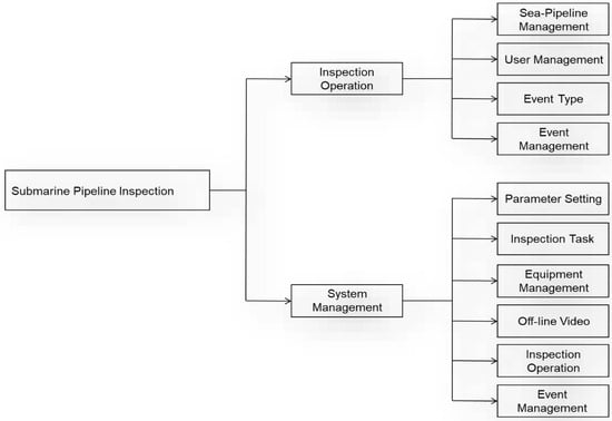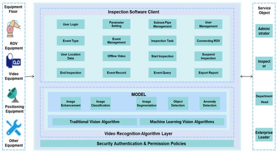 A well-functioning system facilitates the monitoring and operation of the system. The interaction of hardware, software and operators is critical. The subsea pipeline patrol monitoring process includes the equipment access layer, the patrol inspection operation client and the video recognition algorithm layer. The service objects of the system include the system management unit, the patrol inspectors, the department heads and the enterprise leaders. The overall architecture is shown in Figure 9. The device access layer manages the relevant equipment involved in patrol inspection, such as ROV devices, video devices and positioning devices. The device access layer saves the network address and the service port and communication protocol information of the devices. These devices can access the submarine pipeline inspection system through the network, and the information of the acquisition equipment can be used as the parameter input of the subsequent algorithm layer. The client is the main entry for the daily work functions of the patrol operation users. After logging into the system, users can perform various business operations, such as parameter setting, creating patrol tasks, executing patrol tasks, connecting devices, playing ROV videos, enabling event detection, recording abnormal events and exporting patrol reports.