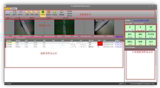 During the patrol inspection process, a task must first be created by selecting the submarine pipeline to be inspected, then filling in the name of the operating vessel and the ROV equipment number, and finally, generating a “pending” patrol inspection. After the task is executed, the ROV device can be connected, and the client software will play video in real time. The ROV device can also be disconnected in device management. The client software supports the selection of local video files for loading and playing through the offline video function. During video playback in the client software, event detection can be started or stopped. When the task is started, the patrol task status is not modified to “Patrol”, the video captured by the camera is transmitted to the algorithm platform and the video is analyzed and processed in real time to detect whether there is a routine event or an abnormal event. “Suspend Patrol” indicates that the patrol task is suspended, and the video will not be transmitted to the algorithm platform for analysis and processing. At the same time, no routine events or abnormal events will be detected. We built a Graphical User Interface (GUI) system (see Figure 11), which is able to perform the above steps well and conveniently.