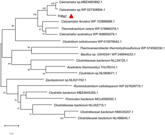 DNA and protein sequences were compared using BLASTx and BLASTp programs (http://blast.ncbi.nlm.nih.gov/Blast.cgi, accessed on 1 April 2019), respectively. The molecular weight of protein ThBg2 was predicted using EXPASY (https://web.expasy.org/protparam/, accessed on 1 April 2019). The multiple alignment of protein sequences closely related to ThBg2 was performed, and phylogenetic analysis was performed using MEGA 7.0 [].