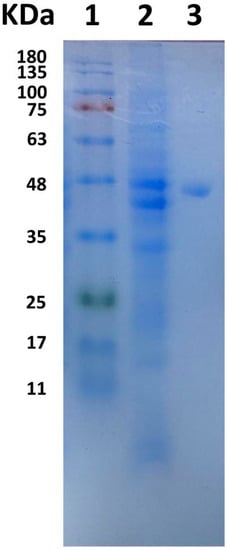 E. coli cells were resuspended in centrifuge tubes with PBS solution (pH 7.6) containing 10 mM imidazole and placed in an ice-water mixture for 30 min with ultrasonic crushing, followed by centrifugation using a high-speed refrigerated centrifuge at 4 °C and 7000 r/min for 20 min. After centrifugation, the supernatant was collected. Purification was conducted using an Ni-NTA column. The Ni-NTA column was equilibrated with five times the column volume of equilibration solution (PBS solution with 10 mM imidazole, pH 7.6). The supernatant mentioned above was added to the Ni-NTA column for loading and repeated once, after which the column was washed with 10 times the column volume of the equilibration solution. The target protein was eluted with three times the column volume of the eluent solution (PBS solution containing 250 mM imidazole, pH 7.6), and the protein solution was collected in 1.5 mL centrifuge tubes with 1.0 mL per tube. The protein concentration was estimated using Bradford reagent, using bovine serum albumin as standard. The absorption value was measured at OD595 and analyzed using SDS-PAGE electrophoresis, after which the target protein was purified (The protein ladder was from Beijing Solarbio Science & Technology Co., Ltd., Beijing, China).