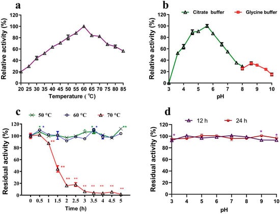 Effects of temperature and pH on the activity and stability of the recombinant ThBg2. (a) Temperature effect on the activity of ThBg2. (b) pH effect on the activity of ThBg2. (c) The effect of temperature on stability at different temperatures (50, 60 and 70 °C) for 0, 0.5, 1, 1.5, 2, 2.5, 3, 3.5, 4, and 4.5 h. (d) The effect of pH on stability. Values represent the mean of three biological replicates. Error bars represent the mean ± SEM of three biological replicates. ** p < 0.01, * p < 0.05. The primary activity was taken as 100%. 100% = 65 ± 2 U/mg.