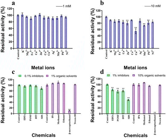 Effect of metal ions and chemicals on recombinant ThBg2 activity. (a) The effect of 1 mM metal ions on the activity of ThBg2. (b) The effect of 10 mM metal ions on the activity of ThBg2. (c) The effect of 0.1% inhibitors and 1% organic solvents on the activity of ThBg2. (d) The effect of 1% inhibitors and 10% organic solvents on the activity of ThBg2. Values represent the mean of three biological replicates. Error bars represent the mean ± SEM of three biological replicates. ** p < 0.01, * p < 0.05. 100% = 65 ± 2 U/mg.