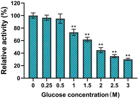 Effect of glucose on the activity of recombinant ThBg2. Values represent the mean of three biological replicates. Error bars represent the mean ± SEM of three biological replicates. ** p < 0.01. 100% = 65 ± 2 U/mg.