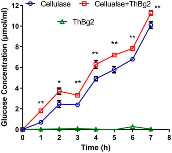 Cooperation of ThBg2 with the commercial cellulase in corn-stalk degradation. The green triangle shows the result of ThBg2 hydrolyzing corn stalks. The blue circle shows the results of commercial cellulase hydrolysis of corn stalks. The red rectangle represents the result of ThBg2 and commercial cellulase synergistic hydrolysis of corn stalks. Values represent the mean of three biological replicates. Error bars represent the mean ± SEM of three biological replicates. ** p < 0.01, * p < 0.05.