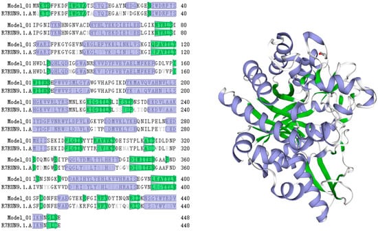 Amino acid sequence comparison of ThBg2 and homology models (left). The purple and green structures represent the α-helix and β-fold, respectively. ThBg2 homology model (right).