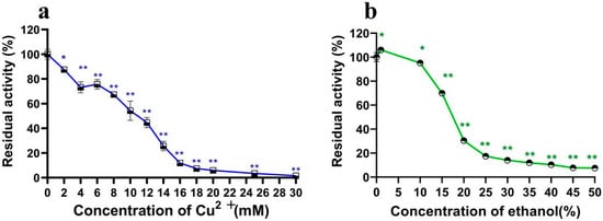 Effect of Cu2+ and ethanol on activity of recombinant ThBg2. (a) The effect of Cu2+ (0–40 mM) on the activity of ThBg2. (b) The effect of ethanol (0–50% mM) on the activity of ThBg2. Error bars represent the mean ± SEM of three biological replicates. ** p < 0.01, * p < 0.05. 100% = 65 ± 2 U/mg.