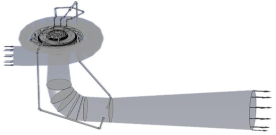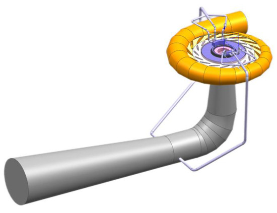 In order to simulate the real situation of the flow in the gap to the furthest extent possible, the calculation domain of the whole flow channel, including the guide vane, runner, gap, draft pipe and spiral casing, was analyzed. The 3D modeling software UG NX 12.0 was used to build up a three-dimensional model of the spiral casing, runner, draft tube, stay vanes, guide vanes, upper crown clearance and lower ring clearance of a pump turbine. The three-dimensional model of the full flow channel is shown in Figure 1.