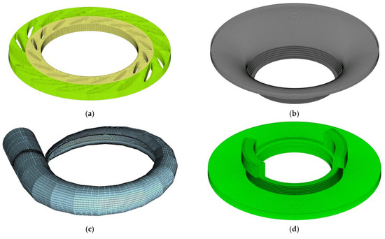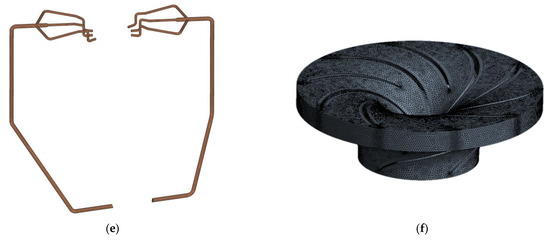 The three-dimensional fluid domain model is shown in Figure 3, where the three-dimensional flow field calculation area includes the fluid domain of the double row cascade (Figure 3a), the lower ring gap fluid domain (Figure 3b), the fluid domain of the spiral casing (Figure 3c), the upper crown gap fluid domain (Figure 3d), the flat pressure tube fluid domain (Figure 3e) and the runner fluid domain (Figure 3e). The final numbers of elements of each component are listed in Table 2.