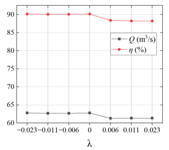 In Equation (10), Dh is the runner diameter. In the analysis, the gap thickness coefficient λ increases or decreases by 0.006, 0.011 or 0.023. The changes of the internal flow field and the axial force of the pump turbine are then analyzed.