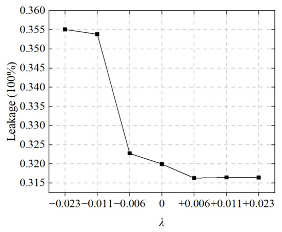 As shown in Figure 7, when the thickness of the coronal gap is reduced, the pressure in the square cavity and narrow gap of the second-stage labyrinth ring near the exit of the gap changes. When λ decreases by 0.006 and 0.011, the pressure tends to be uniform, and when it decreases to 0.023, the pressure distribution is consistent with the original thickness. When the thickness of the coronal gap increases, the pressures in the square cavity and narrow gap of the first-level and second-level labyrinth rings near the exit of the gap decrease. When λ increases to 0.011 and 0.023, the pressure in the central area of the square cavity of the first-level labyrinth ring near the gap exit and the narrow gap connected to the pressure equalizing tube decreases significantly.