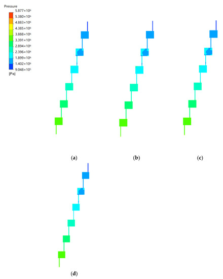 It can be seen from the pressure calculation results that the pressure distribution under different gaps is basically the same. Only the labyrinth ring changes significantly, and the pressure value of the inlet and outlet changes with the gap. As shown in Figure 7, the pressure gradient distribution in the gap flow channel is relatively uniform. The maximum pressure is distributed at the inlet of the crown gap, and the minimum pressure is at the outlet. From the inlet to the outlet of the gap, the pressure decreases continuously along the flow direction, and the pressure energy of the liquid is converted into kinetic energy, which also proves the effectiveness of the labyrinth seal on the decompression of the liquid. The pressure near the pressure equalizing tube is the smallest, which also proves that the pressure equalizing tube has a depressurizing effect.