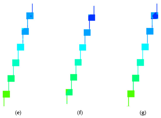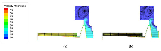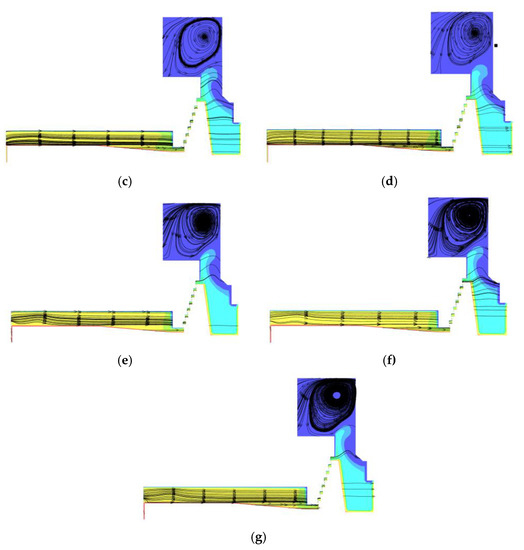 Velocity and streamline distribution of the labyrinth ring under different gap thicknesses. (a) Velocity and streamline distribution when λ = −0.023; (b) Velocity and streamline distribution when λ = −0.011; (c) Velocity and streamline distribution when λ = −0.006; (d) Velocity and streamline distribution when λ = 0; (e) Velocity and streamline distribution when λ = +0.006; (f) Velocity and streamline distribution when λ = +0.011; (g) Velocity and streamline distribution when λ = +0.023.