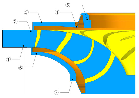 Schematic diagram of 7 monitoring points (①: Lower part of guide vanes; ②: Upper part of vaneless zone; ③: Crown inlet; ④: Crown labyrinth ring front; ⑤: Crown labyrinth ring rear; ⑥: Band inlet; ⑦: Band labyrinth ring front).