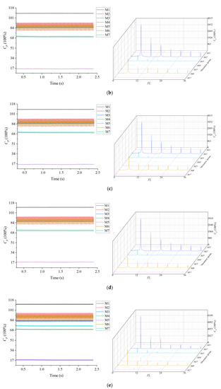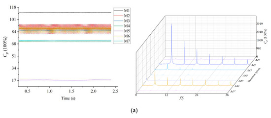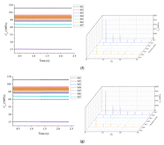 The time domain diagram shown in Figure 11 shows that the pressure values of the pressure measuring points of each flow-passing component fluctuate relative to a certain reference value. Reducing the thickness of the upper crown gap has a weak effect on the pressure of the monitoring point, and increasing the thickness of the upper crown gap has a more obvious impact on the pressure at the entrance of the upper crown, in front of the labyrinth ring of the upper crown and in front of the labyrinth ring of the lower ring, which can reduce the pressure at the entrance of the upper crown and in front of the labyrinth ring of the upper crown. However, it increases the pressure in front of the labyrinth ring of the lower ring.