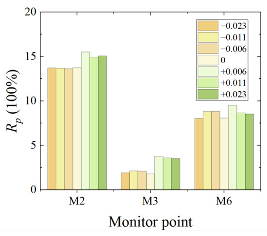 Figure 12 shows the relative pressure fluctuations of the three monitoring points. When the gap thickness of the upper canopy is reduced, the relative pressure fluctuations of the vaneless area are not greatly affected, but the Rp values at the entrance of the upper canopy and the entrance of the lower ring increase. When the thickness of the gap is reduced to 0.023, the relative pressure fluctuations are almost the same as those corresponding to the original thickness. The relative pressure fluctuations in the vaneless area, upper crown entrance and lower ring entrance increase as the upper crown gap thickness increases, and the relative pressure fluctuation range is the largest when the upper crown gap thickness increases by 0.006.