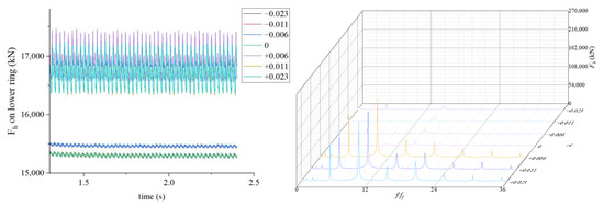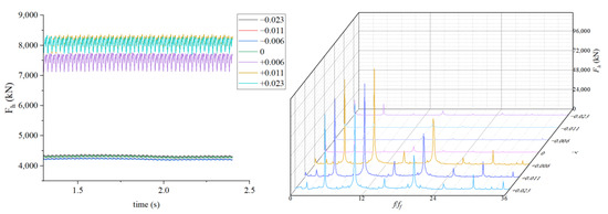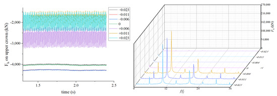 As shown in Figure 13, taking the vertical downward direction as positive, the axial water thrust on the upper crown is positive. When the thickness of the crown gap is reduced, the axial water thrust on the crown also decreases with little fluctuation. However, when the thickness of the crown gap is reduced, the axial water thrust on the crown increases. By increasing the thickness of the crown gap, the main frequency of the axial water thrust on the crown is 10 ff, and the secondary frequency is 15 ff.