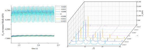 The resultant force of the axial water thrust on the runner is shown in Figure 16. When the thickness of the upper crown gap is reduced, the resultant force of the axial water thrust decreases to about 77 kN, but the value of the resultant force increases slightly when it decreases to 0.023. When the thickness of the upper crown gap is increased, the axial water thrust increases greatly, and the resultant force increases the most when it increases by 0.011, which is about 3828 kN. By increasing the crown gap thickness, the main frequency of the resultant axial water thrust on the runner is 10 ff, and the secondary frequency is 15 ff.