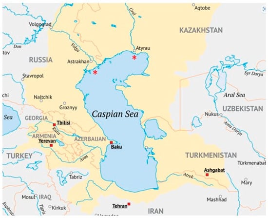 Map of the Caspian Sea and surrounding basin. The mouths of the Volga River (near Astrakhan, Russia) and the Ural River (near Atyrau, Kazakhstan) are marked with red asterisks. Credit: Redgeographics.