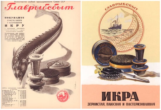Soviet advertisements from the 1950s era. Images of sturgeon, sailing vessels, and elegant packaging were used to encourage consumption of caviar.