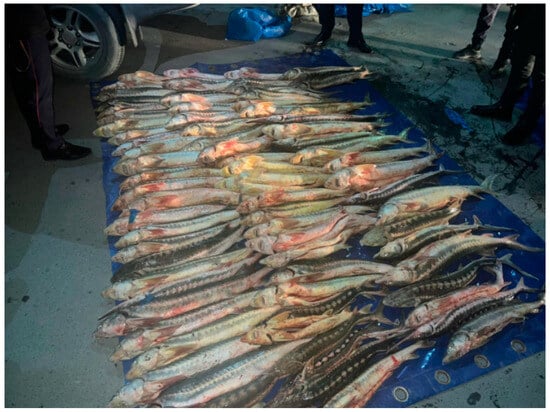 - Poachers with Half a Ton of Sturgeon Were Running Away from Inspectors in Atyrau. Available online: web.archive.org/web/20220818112702/https://mgorod.kz/nitem/brakonery-s-poltonnoj-osetra-ubegali-ot-inspektorov-v-atyrau/ (accessed on 18 August 2022).
