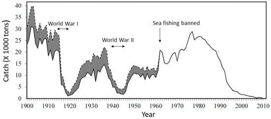 Relationship between disruptions caused by war and the 1962 sea fishing ban and reported sturgeon harvests in the Caspian basin. Pre-1962 harvests were from the sea (the shaded area represents the catch from the southern region). Post-1962 harvests were from the rivers flowing into the sea, primarily the Ural and Volga. Source: Modified from Figure 1 in [65] and used with permission.
