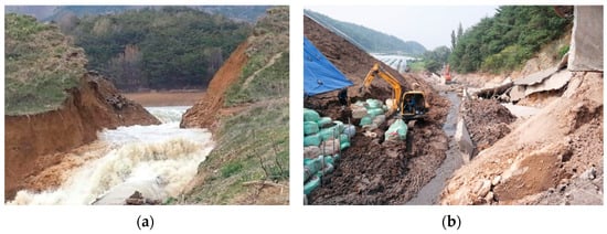 Overtopping poses significant risks, leading to potential landslides in concrete gravity dams and total or partial failures in earth or rockfill dams. The primary causes of overtopping are attributed to a lack of hydrological data and errors in hydrological design. Recent cases in Korea exemplify the consequences of overtopping caused by extreme water level fluctuations due to changes in rainfall patterns. The collapse of the San-Dae Reservoir in Gyeong Ju City, Gyeong-buk Province in 2013 can largely be attributed to the ageing of the reservoir and a decrease in its functionality []. These factors significantly altered its storage capacity. Similarly, the Cho-San Reservoir faced significant challenges during maintenance works to raise the embankment height. A heavy rainfall event with a recorded rainfall of over 300 mm ultimately led to the collapse of a 20 m retaining wall. The collapse of the Geo-Yeon reservoir dam in Yeongcheon City, Gyeong-buk Province, in 2014 was primarily caused by heavy rainfall []. This catastrophic event was exacerbated by the fact that the dam had deteriorated over a span of more than 70 years, ultimately leading to its collapse when inundated (Figure 1).