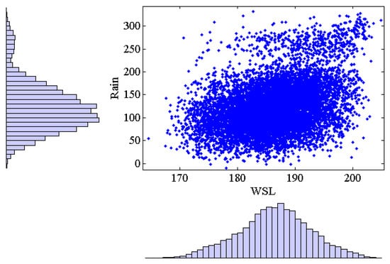 First, the stability of the embankment or dam slope was hydrologically examined to determine the probability of overtopping. An initial water level of the embankment was calculated, which is a major uncertainty variable in the hydrological analysis, using the copula function. This function was based on the statistical relationship between the antecedent rainfall and past data on the water levels, offering an effective means for understanding variable dependency, particularly when examining the distribution between variables. The copula function was first introduced by Sklar (1959) []. This study evaluated the occurrence of unexpected overtopping. For the given probability variables X and Y, the marginal cumulative distribution functions and exist for the multivariate cumulative distribution function . If these marginal cumulative distribution functions are independent of each other, a copula function C also exists. Here, the marginal cumulative distribution functions and are determined by the probability distribution functions of the probability variables X and Y. The copula function defines the multivariate cumulative distribution function of the marginal cumulative distribution functions and , as shown in Equation (1). In this equation, x represents the antecedent rainfall and y corresponds to the dam water level, corresponding to the observed x.