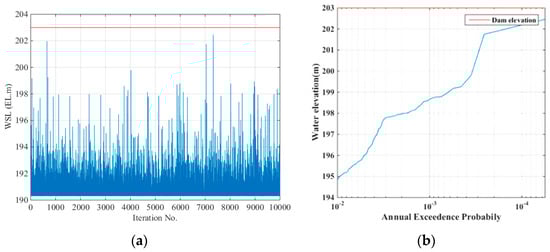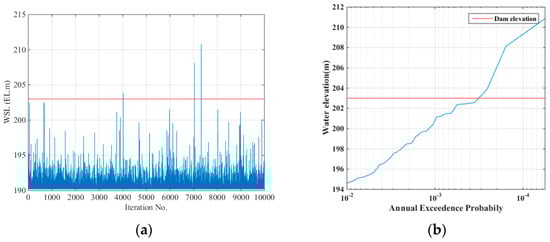 Figure 4 illustrates the results of the analysis, assuming that the initial water levels were the designed flood water levels. The red line in Figure 4 represents the dam crest, and the simulation was performed 10,000 times. The figures demonstrated that no overtopping events occurred when the dam operation simulations were based on the design flood water level, and the annual exceedance probability remained stable even at a 10,000-year recurrence interval. Figure 5 presents the results of the analysis, assuming the initial water levels derived from antecedent rainfall using the Gumbel function. It was found that no overtopping events occurred during the dam operation simulations when considering the conventional projected flood elevation. However, overtopping events were observed when considering the water level fluctuations, estimating potential dam overtopping at a design frequency of approximately 6000 years. The difference between these results was the result of confirming the stability up to a 10,000-year return period by setting the initial water level of the dam as the design flood level and the fluctuating water level during the dam operation simulation. The results emphasized the effectiveness of considering antecedent rainfall in the simulation.