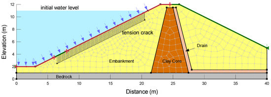For the slope stability analysis, the soil parameters such as the unit weight, cohesion, and internal friction angle were selected based on the average values derived from the literature, which are listed in Table 5. Bishop’s simplified method of slices for circular slip surfaces was used in the calculation of the factor of safety. For the seepage analysis under drawdown conditions, the hydraulic soil parameters such as the saturated permeability and unsaturated permeability function were inferred from the soil water characteristic curve [] for each soil layer, as listed in Table 5. In the seepage analysis of unsaturated soil, the fitting parameters (e.g., a, n, m, of the soil–water characteristic curve (SWCC)) were determined using the van Genuchten (1980) equation []. Figure 6 illustrates the finite element model on a typical embankment, consisting of a clay core and a drain system. The bedrock was set as an impermeable layer at the bottom. Since drawdown represents the most unstable condition for the embankment slope, the factor of safety at the pore-water distribution in the upstream slope during a 5-h drawdown was thoroughly examined. The difference in the safety factor was analyzed by comparing and not considering the tension cracks on the embankment slopes. Tension cracks are associated with slope failure during shrinkage due to a rapid drawdown of the water level, which could be modeled in the analysis [,].