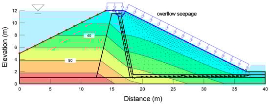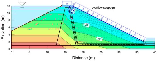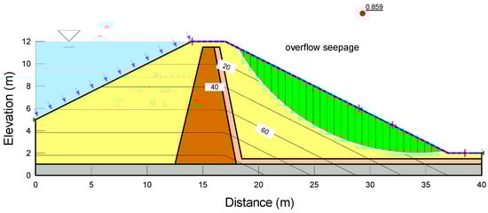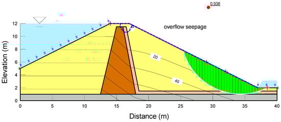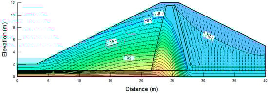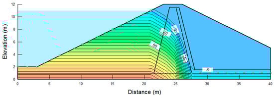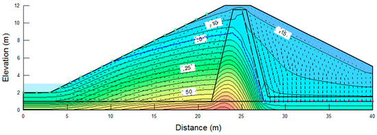 In the previous section, the hydraulic stability of embankment overtopping was assessed using probable rainfall scenarios to account for extreme rainfall caused by climate change, enabling a comprehensive examination of potential overtopping occurrences. To evaluate the geotechnical stability of the embankment due to overtopping, a slope stability analysis was conducted with the incorporation of the unsaturated soil characteristics and water infiltration. In the analysis of this study, the numerical simulation was performed, assuming that the height of the embankment was approx. 10 m. However, similar results were obtained in the cross-section of a larger scale, so the tendency for stability could be inferred [,]. A seepage analysis with the design flood water level was carried out to determine the stability of the embankment slope due to drawdown. The factor of safety for the upstream and downstream slopes was calculated using Bishop’s simple method, and appropriate countermeasures were proposed if the values were below the factor of safety listed in Table 4.