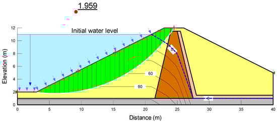 Stability of an embankment before rapid drawdown under the initial conditions (Fs = 1.959).