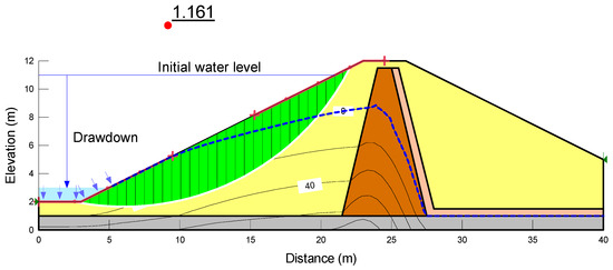 Stability of an embankment with rapid drawdown after one day (Fs = 1.161).