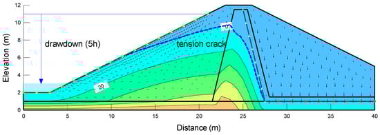 In this section, the safety factor of the embankment slope was calculated with the incorporation of tension cracks. In most cases, tension cracks represent the primary factor contributing to the failure of the embankment slope during drawdown events by decreasing the shear resistance to slip failure. As a result, the distributions of the pore-water pressure obtained from the seepage analysis remained consistent whether tensile cracks were present (Figure 13) or absent (Figure 9) on the slope of the embankment. However, a shallow failure was observed in the slope, as shown in Figure 14. It was attributed to the presence of tension cracks after 5 h of drawdown. In this case, the embankment slope exhibited a lower safety factor compared to the scenarios where no tensile cracks were present.