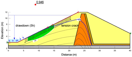 Stability of an embankment with drawdown after 5 h (Fs = 0.946).