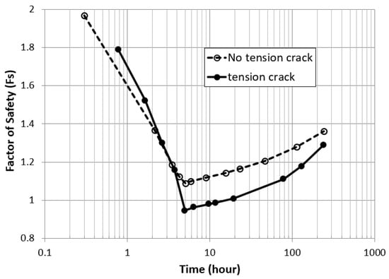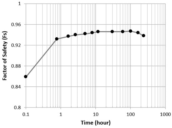 In general, when an embankment slope that has been submerged for an extended period is suddenly exposed to sunlight during drawdown, it is prone to the formation of tensile cracks, significantly elevating the risk of collapse. Figure 15 shows the changes in the factor of safety for the upstream slope over time after drawdown. The lowest factor of safety was obtained at 5 h due to a higher pore-water pressure remaining in the embankment slope, resulting in a significant reduction in the effective stress. However, the factor of safety tended to recover after 5 h as the pore-water pressure decreased. As observed in the comparison, the embankment slope during drawdown was vulnerable to failure caused by tensile cracks. These cracks represent a pivotal factor that can lead to potential collapses, thereby emphasizing the necessity for a thorough evaluation of the reinforcement measures during construction.