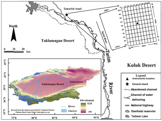 In this study, we conducted a field investigation of spatial and temporal variability in soil moisture in a tamarisk (Tamarix spp.) stand in the lower Tarim River basin of China. This area is hyper-arid with a mean annual precipitation of less than 50 mm. The influence of rain on soil moisture can be ignored in this area due to the rare rain. The water source of the studied tamarisk stands is mainly from groundwater rather than flood watering for at least fifty years because this area had been dried out for more than 30 years before artificial water conveyance began in the year 2000 [39]. Moreover, the artificial water conveyance project did not cause any flooding to occur over the riverbanks. Tamarisk is a typical xeric phreatophytic shrub, groundwater-dependent, and not sensitive to precipitation [40]. The groundwater-controlled and phreatophyte-covered stand provides an ideal field investigation site to explore the soil moisture dynamics under the control of the groundwater and analyze their controlling mechanism in hyper-arid regions.