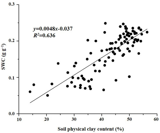 Linear relationship between the gravimetric soil water content (SWC) and soil physical clay content.