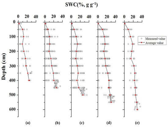 The GWD ranged from 3.4 m to 6.1 m in the tamarisk stand and generally increased with the increasing distance to the river channel located at the west side of the stand (Figure 2b). Five levels of GWDs were classified according to the range of GWDs in the stands: 3.4–4.0 m, 4.0–4.5 m, 4.5–5.0 m, 5.0–5.5 m, and 5.5–6.1 m. The general soil moisture profile characteristics were similar between different GWD levels (Figure 4). The mean soil water content (SWC) increased from the surface to the water table. However, there was a soil layer at an approximate depth of 1.0–2.0 m, in which the SWC was relatively higher than that in the adjacent deeper layer. Based on the observed soil moisture profiles, four soil layers that expressed the soil moisture profile distribution characteristics could be identified in the stand: the surface layer, the shallow layer, the middle layer, and the deep layer. The surface layer is located at a depth of 0–0.3 m, and the depths of the other three layers depend on the GWD levels. The shallow layer was approximately at a depth of 0.5–2.0 m, the middle layer was approximately at a depth of 1.5–2.5 m, and the deep layer was approximately below 2.0 m.