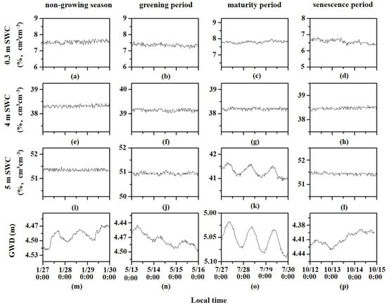 In the non-growing season, the soil moisture in all the soil layers did not exhibit any diurnal variations (Figure 5a,e,i). The soil moisture at the depths of 0.3 m and 4.0 m did not exhibit any diurnal variation in the whole growing season (Figure 5b–d,f–h). However, the soil moisture at the depth of 5.0 m showed obvious diurnal fluctuation in MP, in which the SWC at the depth of 5.0 m decreased in the daytime and got recharged at night (Figure 5k). This diurnal fluctuation occurred in MP but did not in other phenological stages in the growing season (Figure 5j,l). The GWD showed diurnal fluctuation in the whole growing season (Figure 5m–p). The GWD diurnal fluctuations were weak in GP (Figure 5n) and SP (Figure 5p) but obvious in MP (Figure 5o).