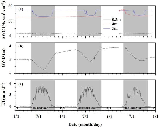 Three years of data on the soil moisture at different depths (0.3 m, 4.0 m, and 5.0 m), the corresponding GWD, and daily ET data are shown in Figure 6. The soil moisture in most of the soil layers hardly changed in the first two years, except in the layer near the water table, where the SWC in the non-growing season remained at 51%, although after the onset of the growing season, it would fall gradually until approximately 39%, and then remain stable (Figure 6a). In the late growing season, the SWC would rise gradually to 51%. This course was typical in the first year of the observation. However, in the second year, the date of the onset of the SWC decrease occurred later and finished earlier than in the first year (Figure 6a).