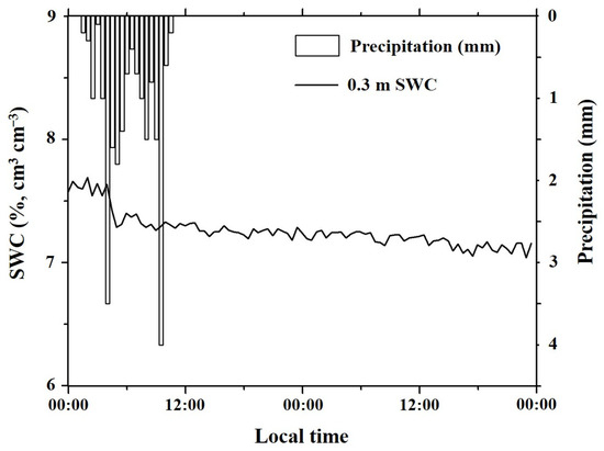 Temporal variation in soil water content (SWC) at a depth of 0.3 m after a heavy precipitation event.