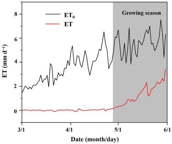 Soil evaporation is an important factor influencing the dynamics of the soil moisture in the surface and shallow layers. Our water and heat flux observation in the stand indicated that the soil evaporation was weak in the hyper-arid regions [41,44]. The surface ET in the non-growing seasons was less than 0.1 mm d−1, especially in April before the growing seasons (Figure 8). In April, the air temperature and wind speed were close to them in the growing season and the potential evapotranspiration (ET0) was almost the same as that in the growing season, although ET was still less than 0.1 mm d−1. Until the onset of the growing season, the surface ET started to increase (Figure 8). This phenomenon indicated that the surface ET was mainly from plant transpiration, and that the soil evaporation was very weak. The occurrence of the extremely dry surface layer in this area can prevent soil evaporation, thereby reducing the loss of soil moisture.