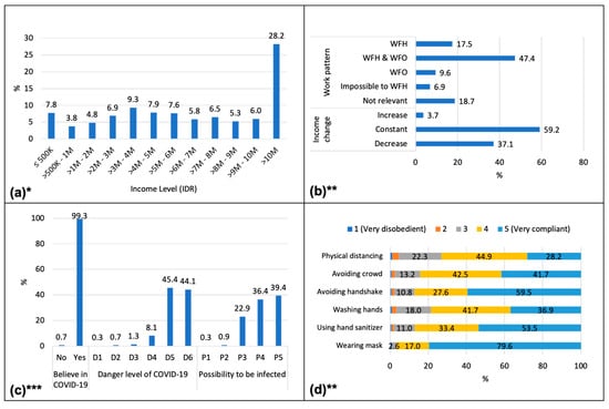Distribution characteristics of respondents by (a) income group; (b) changes in work and income patterns due to the pandemic; (c) perception of COVID-19; (d) compliance with health protocol-related activities during the pandemic. All figures are expressed in percentage of respondents with a total of 100% (n = 889). Notes: * IDR = Indonesian Rupiah ** WFH = working from home, WFO = working from office *** D1 = Not dangerous at all, D6 = Very dangerous. P1 = Very impossible, P5 = Very possible. Due to space constraints, only notable proportions are displayed; for complete details, please refer to the Supplementary Materials (Table S2). Source: Online survey result.