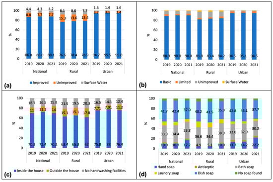 Figure 3a shows that in 2019, 87% of households had access to improved sanitation-water sources, which increased to 88% in 2021. Over the study period, the proportion of households using unimproved and surface water sources decreased. A similar trend was observed in rural areas, except in 2021, where the proportion of households with access to improved sanitation-water sources decreased.