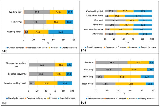 Changes in (a) frequencies of hygiene activities; (b) handwashing frequency; (c) hygiene products use frequency; (d) consumption/purchase quantity of water and hygiene product use, during the pandemic in comparison to before the pandemic. All figures are expressed in percentage of respondents with a total of 100% (n = 889). Due to space constraints, only notable proportions are displayed; for complete details, please refer to the Supplementary Materials (Table S2). Source: Online survey result.