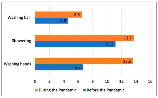 While some respondents reported an increased frequency of showering and hair washing, a notable portion (43.5%) reported no change in showering frequency, and (52%) reported no change in hair washing frequency (Figure 4a). On average, the frequency of showering slightly increased from 11.2 times per week before the pandemic to 13.7 times per week (twice a day) during the pandemic (Figure 5). Similarly, the average frequency of hair washing increased from 4.6 times per week before the pandemic to 6.5 times per week (once a day) during the pandemic. These findings are consistent with a study conducted in Saudi Arabia, where there was an increase in showering and hair washing frequency during the COVID-19 pandemic, likely due to preventive measures [39]. This increase in hygiene activities during the pandemic might result in increased water and hygiene product consumption.