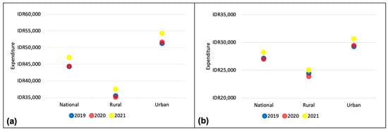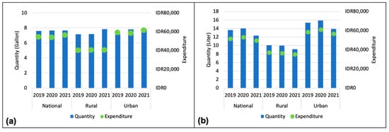This study also examined the quantity and expenditure of bottled water consumption. At the national, urban, and rural levels, the average quantity of 19 L-bottled water increased in 2021, accompanied by a slight increase in expenditure (Figure 8a). This trend was likely driven by the growing demand for clean and more convenient sources of drinking water during the COVID-19 pandemic [41,42]. The greater increase in quantity compared with the rise in expenditure suggests that the household may have transitioned from branded (more expensive) bottled water to refillable (cheaper) bottled water in order to meet their drinking water needs while managing reduced income during the pandemic.
