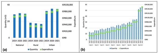 Average monthly quantity and expenditure on (a) piped water; (b) piped water based on household expenditure category, in Indonesia 2019–2021 (please refer to Table 1 for the description of the n values). Notes: IDR = Indonesian Rupiah. Source: SUSENAS 2019–2021, authors’ calculations.