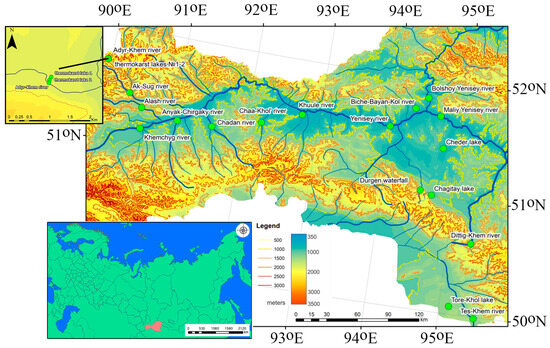 During the period of our study, the temperature ranged from −28 °C to 21 °C, and the precipitation was equal to 322 and 144 m during 2021 and 2022, respectively. (http://www.pogodaiklimat.ru/history/36096_2.htm, accessed on 23 September 2023). The water objects sampled in this work include numerous water bodies mainly belonging to the Yenisei River basin, whereas only a small number belonged to the closed basin of the Ubsunur basin.